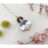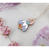 The laser-cut acrylics are backed onto lightweight thin plywood, and the pendant hangs from a 45cm fine gold-plated necklace chain.